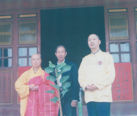 - 2007年11月9日觉森居士护送菩提树苗到福建清流县。图左为云海寺大和尚大愿法师,图右为全球华人联合会主席吉祥
