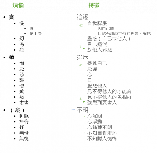 人生在世有林林总总的烦恼,这些烦恼有多少种呢? 经中常提到三毒、五盖、本经中则提出二十一心结。是怎么将烦恼区分为这么多种呢? 其实这些数字并不神秘,而有其背后的脉络可循: 佛陀表示所有烦恼都是由无明(无智)而来,由于无明而执著于自我,因此有种种的烦恼,若能觉悟就没烦恼了。 若要再分类,凡夫因为无明、没有智慧(也就是“痴”),以自我为中心,对于我所喜爱的,就起贪;我所喜爱的得不到、有违逆我的,就生瞋。就这样区分出贪、瞋、痴这“三毒”。 除此之外,经中对烦恼也有更多种类的列举,像是贪欲、瞋恚、睡眠、掉悔、疑这五种覆盖心识、阻碍善法发生的“五盖”,是要在禅坐时训练去除的。五盖是怎么数出来的呢? 就感官接触外境时的应对来看,追逐为贪欲盖,排斥为瞋恚盖。就自心状态的高低来看,沉闷怠惰是睡眠盖,浮动不安是掉悔盖。自心犹豫不明则是疑盖。如下图所示: 本经则进一步细分出二十一心结,其脉络如下图所示: (以上各心结间的关系,有的见仁见智,在不同的部派分类略有不同。) 在更高的层次,甚至连善心都要能超越,《大日经》中即罗列一百六十种须要超越才能解脱的心。 从一念无明,到三毒、五盖、二十一心结、百六十相续心,这些列举或分类不是一成不变的,像本经相当的南传经文就列出十六个心结(南传称作“随杂染”),而不是二十一个。 无论列举或区分为多少种的烦恼,都是为了让我们训练自己由粗至细能一一认出、如实知每个当下心的状态,进而解脱烦恼。