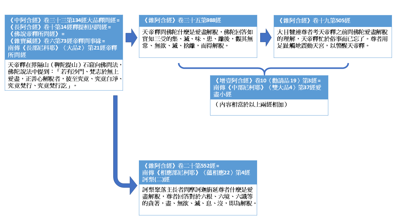 本经记载天帝释于石窟中向释迦牟尼佛请教,当中佛陀提到:“若有沙门、梵志于无上爱尽,正善心解脱者,彼至究竟、究竟白净、究竟梵行、究竟梵行讫。” 基于这句话,日后天帝释向佛陀进一步询问什么是“爱尽解脱”,该段对话又引生后续的问答及事件,算是横跨四部阿含、尼柯耶,传诵天上与人间的问答接龙。这些经载彼此间的关系如下图所示: [进阶辨正](一三五)中阿含ⓐ大品善生经第十九(第三念诵)ⓑ我闻如是: 一时,佛游王舍城,在饶虾蟆林。 尔时,善生居士子,父临终时,因六方故,遗敕其子,善教善诃曰:“善生!我命终后,汝当叉手向六方礼:‘东方若有众生者,我尽恭敬、供养、礼事彼。我尽恭敬、供养、礼事彼已,彼亦当恭敬、供养、礼事我。如是南方、西方、北方、下方、上方,若有众生者,我尽恭敬、供养、礼事彼。我尽恭敬、供养、礼事彼已,彼亦当恭敬、供养、礼事我。’” 善生居士子闻父教已,白父曰:“唯。当如尊敕。” 于是,善生居士子,父命终后,平旦①沐浴,著新刍摩ⓒ衣,手执生拘舍叶,往至水边,叉手向六方礼:“东方若有众生者,我尽恭敬、供养、礼事彼。我尽恭敬、供养、礼事彼已,彼亦当恭敬、供养、礼事我。如是南方、西方、北方、下方、上方,若有众生者,我尽恭敬、供养、礼事彼。我尽恭敬、供养、礼事彼已,彼亦当恭敬、供养、礼事我。” 彼时,世尊过夜平旦,着衣持钵,入王舍城而行乞食。世尊入王舍城乞食时,遥见善生居士子平旦沐浴,著新刍摩[*]衣,手执生拘舍叶,往至水边,叉手向六方礼:“东方若有众生者,我尽恭敬、供养、礼事彼。我尽恭敬、供养、礼事彼已,彼亦当恭敬、供养、礼事我。如是南方、西方、北方、下方、上方,若有众生者,我尽恭敬、供养、礼事彼。我尽恭敬、供养、礼事彼已,彼亦当恭敬、供养、礼事我。” 世尊见已,往至善生居士子所,问曰:“居士子!受何沙门、梵志教,教汝恭敬、供养、礼事,平旦沐浴,著新刍摩[*]衣,手执生拘舍叶,往至水边,叉手向六方礼:‘东方若有众生者,我尽恭敬、供养、礼事彼。我尽恭敬、供养、礼事彼已,彼亦当恭敬、供养、礼事我。如是南方、西方、北方、下方、上方,若有众生者,我尽恭敬、供养、礼事彼。我尽恭敬、供养、礼事彼已,彼亦当恭敬、供养、礼事我耶?’” 善生居士子答曰:“世尊!我不受余沙门、梵志教也。世尊!我父临命终时,因六方故,遗敕于我,善教善诃曰:‘善生!我命终后,汝当叉手向六方礼:“东方若有众生者,我尽恭敬、供养、礼事彼。我尽恭敬、供养、礼事彼已,彼亦当恭敬、供养、礼事我。如是南方、西方、北方、下方、上方,若有众生者,我尽恭敬、供养、礼事彼。我尽恭敬、供养、礼事彼已,彼亦当恭敬、供养、礼事我。”’世尊!我受父遗教,恭敬、供养、礼事故,平旦沐浴,著新摩[*]磨衣,手执生拘舍叶,往至水边,叉手向六方礼:‘东方若有众生者,我尽恭敬、供养、礼事彼。我尽恭敬,供养、礼事彼已,彼亦当恭敬、供养、礼事我。如是南方、西方、北方、下方、上方,若有众生者,我尽恭敬、供养、礼事ⓓ彼。我尽恭敬、供养、礼事彼已,彼亦当恭敬、供养、礼事我。’” 世尊闻已,告曰:“居士子!我说有六方,不说无也。居士子!若有人善别六方,离四方恶不善业垢,彼于现法可敬可重,身坏命终,必至善处,上生天中。居士子!众生有四种业、四种秽。云何为四?居士子!杀生者,是众生业种、秽种,不与取、邪淫ⓔ、妄言者,是众生业种、秽种。”于是,世尊说此颂曰: