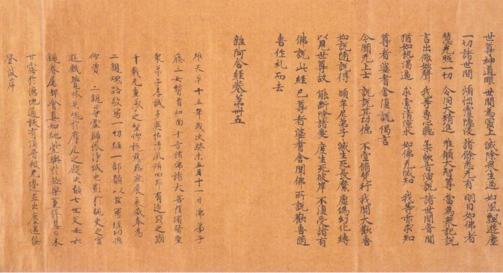 正仓院的不同的经的原手抄本最后都有这一段话,因此可确定光明皇后愿文是这么一回事了。 和读经本身没直接关系,只是因为历来一些朋友对此句都有些疑问,从日本拍卖会场的手抄本得到答案,提供给以后对此事疑惑而用关键字搜寻到这篇的人参考 :) Heawen Chou: 真厉害, 以前一直怀疑是一篇愿文, 还真的找出来了. David Chiou: 是网络厉害,这种资料都搜寻得到 :D 放资料的人也不一定是好心,而是拍卖公司要拍卖古代的佛经手抄本,因此扫描放上网作宣传。殊不知真正的佛教徒不需要买手抄本,看扫描本就够了 :P 过几天又有一大批当初流到日本的敦煌写本要到北京拍卖,希望大家多多照相存证 :D Peter Zou: 当时抄经非常盛行,所抄经文后亦多有愿文,愿文应是是天皇的近臣所拟,之后的菅家文草中有收录一些可参考。 ⋯ 奉太皇大后(明子)令旨,奉为太上天皇(清和上皇)御周忌法会愿文 元庆五年十一月十六日。 银像药师佛一躯,日光月光菩萨像各一躯,金字法华经八卷,无量义,普贤观经,般若心经各一卷。奉为登遐太上天皇周忌斋会,所恭敬庄严也。天皇以去年十二月四日,就泥洹于圆觉(圆觉寺)仙房。今起十一月二十六日,修功德于清和旧院。先期八日,待七净土之遍惊,开讲四朝,愿一乘法之长演。夫寒雨难禁,三界惣是芭蕉。闪光易飞,众生谁非石火乎。先皇叩根机以催道,追因果而结缘。当为他界遍周之君,岂只我家生老之于。仰愿,瑠璃光如来,导圣灵于瑠璃地,莲华大乘教,镇圣灵于莲华台。三千国土,皆是先皇之本宅。百亿须弥.皆是先皇之旧居。同因善根,俱得安乐。 http://miko.org/~uraki/kuon/furu/text/waka/kanke/bunsou/bunsou11.htm Huiyi Lin 前言: 最近去特殊资料馆藏地查询光明皇后愿文电子档资料(《圣语藏经卷》,宫内厅正仓院事务所编,东京:丸善雄松堂株式会社,2000~年)。这种资料在日本只有少数图书馆有购藏,毕竟研究这批经典的学者是少数中的少数,且这种高贵(以史料价值而言)的资料虽然是电子版,制作成本高昂。较早出版的光碟以22片CD为一组,一组约四十万台币,共四组,也就是一百六十万台币。后出的改为DVD,2~4片为一组,目前有十二组,共约台币五百万,(还有未出版的)。整套购买约台币六七百万,所以日本的一般大学图书馆不会特意采购。不过,其实阿含经中的一篇有光明皇后愿文的经卷曾经来台湾展示过,那就是故宫南院在2016年底至2017年初向日本借来的国宝展示,其中就有收藏于东京博物馆的一卷“杂阿含经第四十五卷”(请见以下插图)。 图版来源:《日本美术之最—东京、九州国立博物馆精品展》,台北:故宫博物院,2016年。 Huiyi Lin: 光明皇后(701-760)发愿写经的底本主要来自日僧玄昉从唐朝带回的佛教典籍。据推测这批有光明皇后愿文的经卷约七千卷,即现在所谓的“圣本”,完整名称为“圣语藏经卷”。抄写这些经卷的人当然不是光明皇后一人,主要是由一群称为写经生的人负责抄写,所以会有不同笔迹的情况,而有些保存良好的经卷后面也会看到抄写者的姓名。 在当时,这些抄写完的经卷保存于东大寺尊胜院,不过历经天灾人祸后,现存约一千卷,其中七百五十卷仍保存于东大寺的正仓院,其余两百多卷散佚在民间,所以东京博物馆才会收藏有一卷杂阿含,而古物拍卖会上也会出现这类拍卖品。目前日本出版的“圣语藏经卷”电子资料则是根据正仓院的收藏制作而成。 虽然光明皇后的愿文写了约七千卷,但她并非发了数千多个愿,而是主要发了三种愿,即“天平十二年(740)五月一日”、“天平十五年(743)五月十一日”、“天平宝字四年(760)正月十一日”,这三种愿文。所以我们会看到不同经卷的最后都写有相同的愿文。在以下提供之“杂阿含经”图档可看到“天平十五年五月十一日”的愿文,目前有这篇愿文的经仅存八卷。且目前可见的“杂阿含经”内的愿文都同样是“天平十五年五月十一日”的文本。 附带一提,有光明皇后愿文的“杂阿含经”,现存可知的只有三卷: