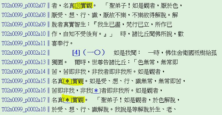 Pohchee Lim: 《杂阿含经》第203经的校勘 5. PDF pg.338 校勘v v “座”,大正藏原为“坐”,今依据宋、元、明三本改作“座”。* * 是否源自 209经 倒数第二行? David Chiou: 我大概知道 Pohchee 的意思了。 有*号代表这个校勘会再次出现,届时就以*指出来。 但第203经该页没有其余的“座”字,一直到几页之后的第209经才再次出现“座”字: Pohchee 指出的是:“在大正藏因为一页有非常多字,第203经、209经可能是在同一页,因此校勘是这么写。在《好读 杂阿含经》则第203经、第209经,已跨了很多页,还是用这样的*标示吗?还是第203经作一次‘座’的校勘标示、第209经再作一次‘座’的校勘标示?” 我觉得都可以,毕竟真得那么细心的读者应该会看得懂。理论上不同页再作一次校勘标示会更清楚,但这样美编就更累了,因此要由Melon决定。 Melon Lien: 大家好, 星号的标示规则若要现在变更, 那么对文编、美编、校对而言,都是不小的工程, 还请文编讨论后决定, 若有任何变更请一并标示在PDF档上, 我就照着修改即可。 谢谢。 melon David Chiou: 我请教 CBETA Heaven 大正藏在此点的规则:“好像不是单纯以经或页为单位。请问是不是以卷为单位,同卷已出现过的就不再标*?” 以下是 Heaven 的回复: 其实大正藏星号的范围, 我们也不确定, 以下图为例, 那个 “实” 字的校勘是跨越了第九经与第十经. 在过去的经验中, 有时它是在同一页, 有时会跨页. 记得过去有试着找规则, 但好像在同一卷但隔了几页, 就重新另立校勘, 而不是用星号. 或是跨卷了, 但在同一页, 所以依然用星号. 我想这是因为书本编辑是依当时的方便吧, 因此没有完全一致的规范. 至于我们自己编的书, 就看是不是要调整成一致的规则. heaven David Chiou: 看来真的要完全一板一眼,实在是太复杂且费时了,大正藏本身就没有完全严谨的规则。 我们以读者能理解为最高原则,决定不花费太多时间重新一页页修改校勘,因此不改内文校勘的*,只在“本书使用方法”的部分,将“校勘”的说明略改为如下: